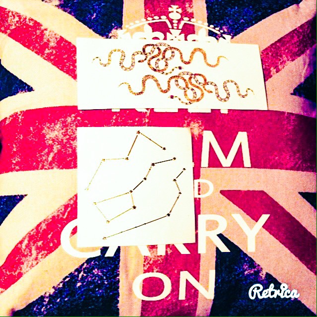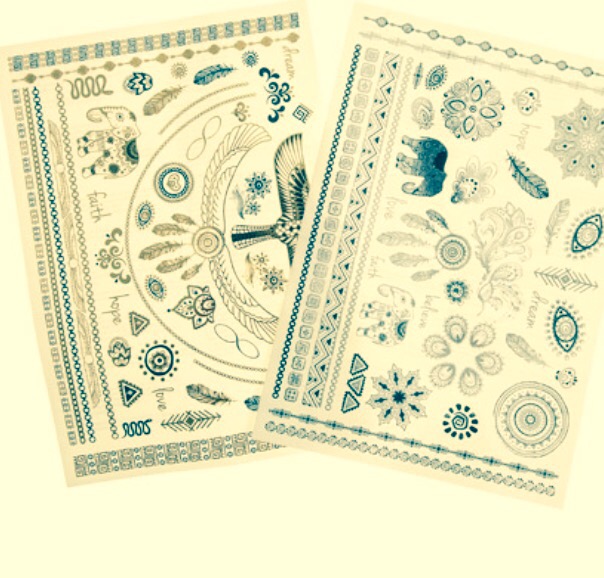 Want to shine for a few days? Why not try a temporary metallic tattoo? Those [picture above] are from Swildens. They last for 2 to 4 days. You can also buy one from Claire’s [picture underneath] http://www.claires.fr/silver-and-gold-boho-metallic-temporary-tattoos/shop/fcp-product/45762