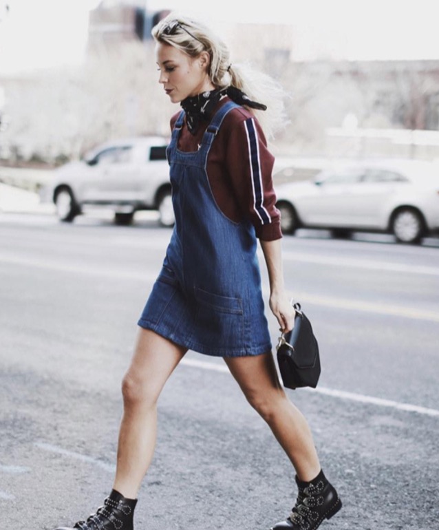 ->pair a striped sweater with a denim dress for a fashionable outfit: