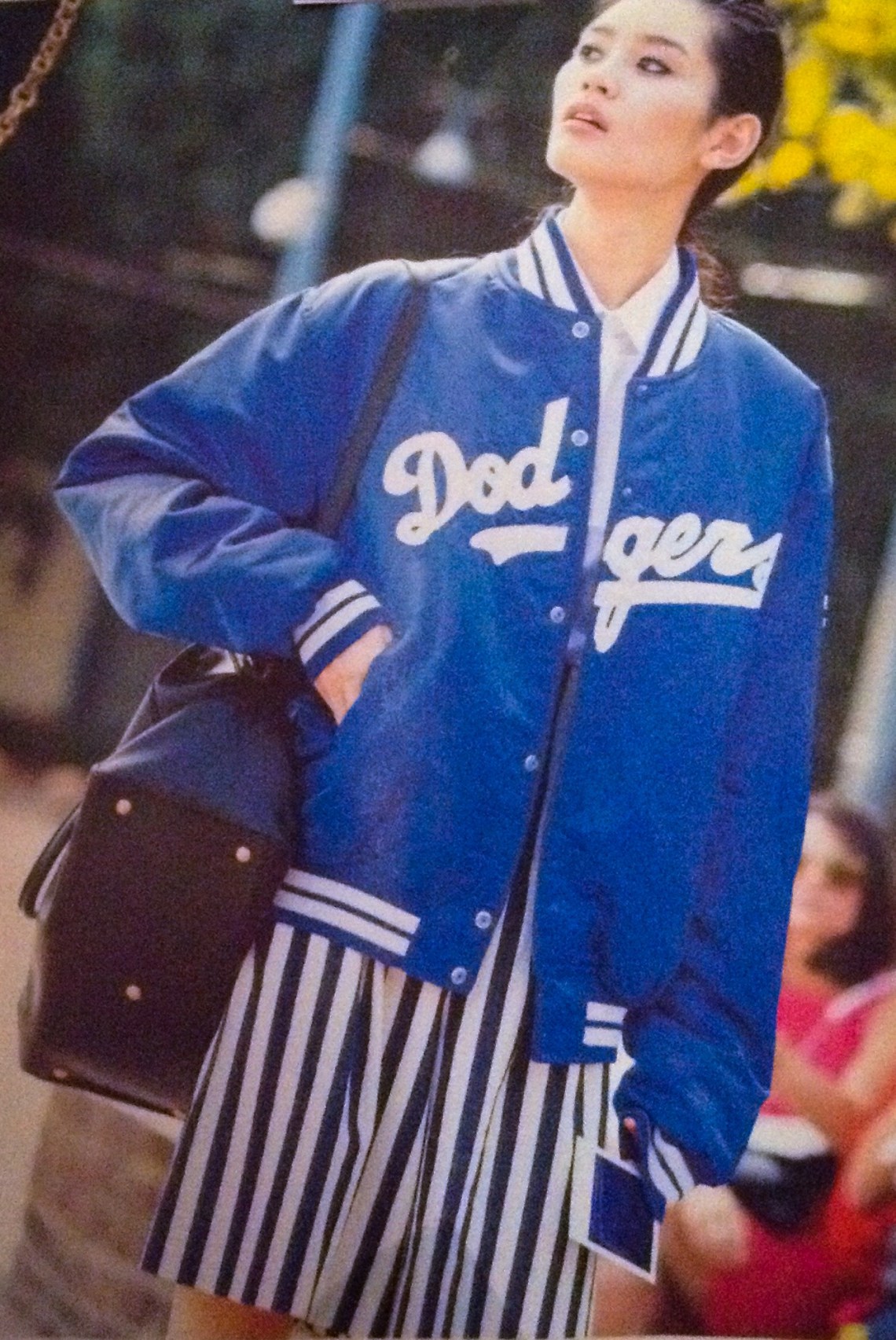 ->You can also wear a striped skirt with a varsity jacket for a more casual look (perfect for a shopping day):