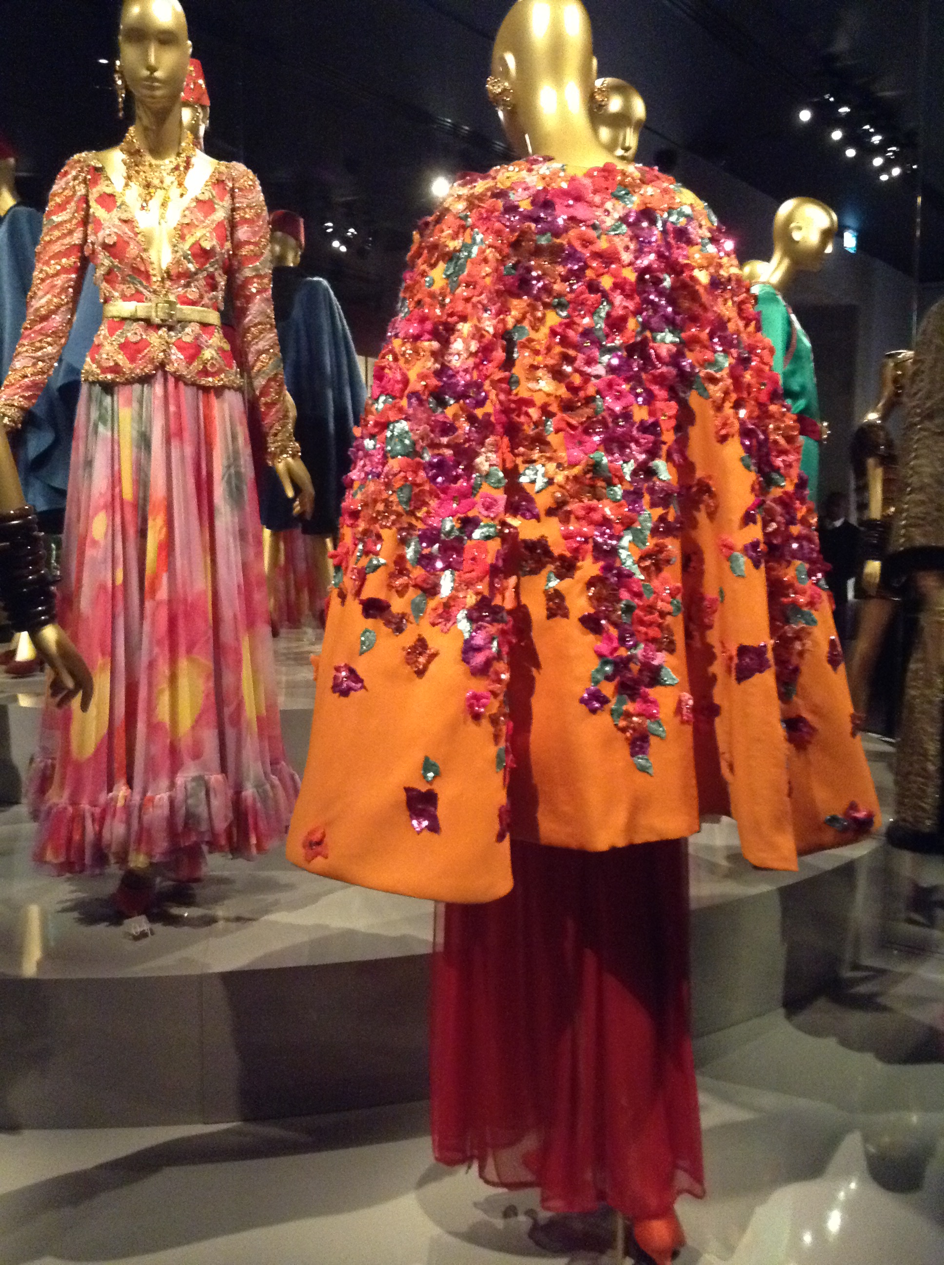 Night cape. SS 1989 (Gazar silk, flower embroideries) and dress made out of silk. These “bougainvilliées” capes evoke flourishing gardens of Morocco where YSL discovers color in 1966. His trip to Morocco influences the colors he chooses mix together: pink and orange, green and blue or red and purple -bright and original color combinations. These capes are meant to be “wearable gardens”. There prominent embroidery embody flower movements.