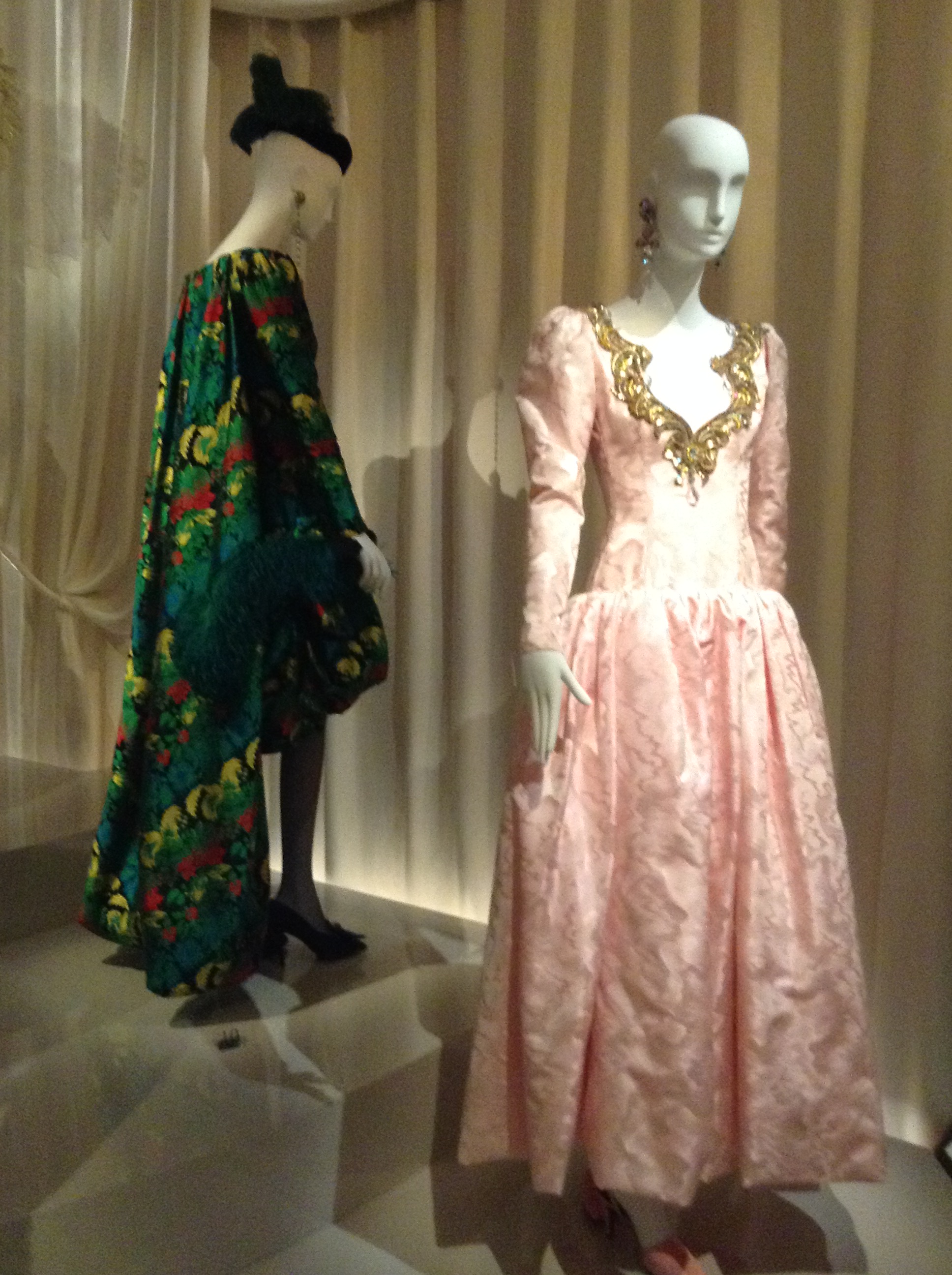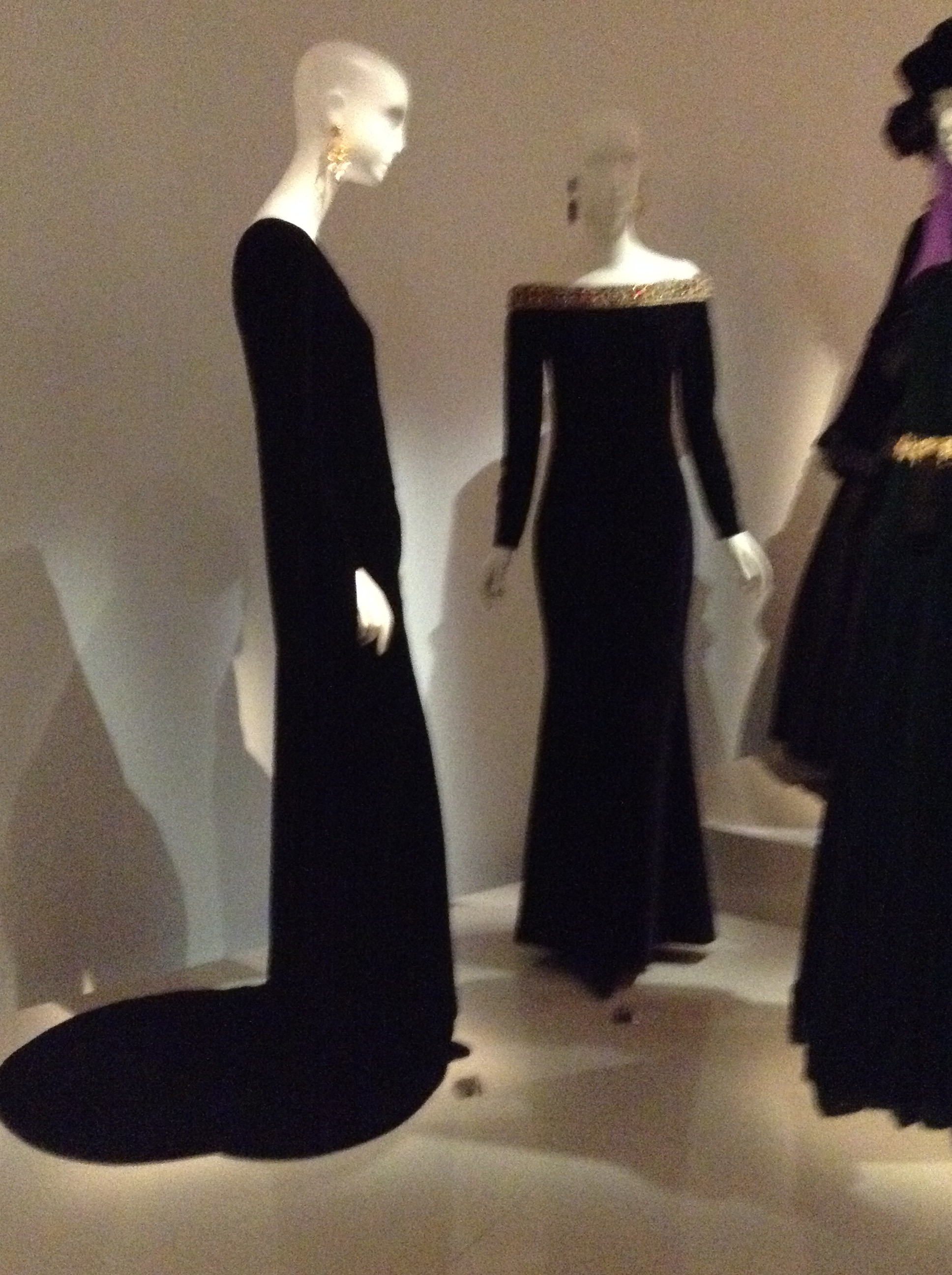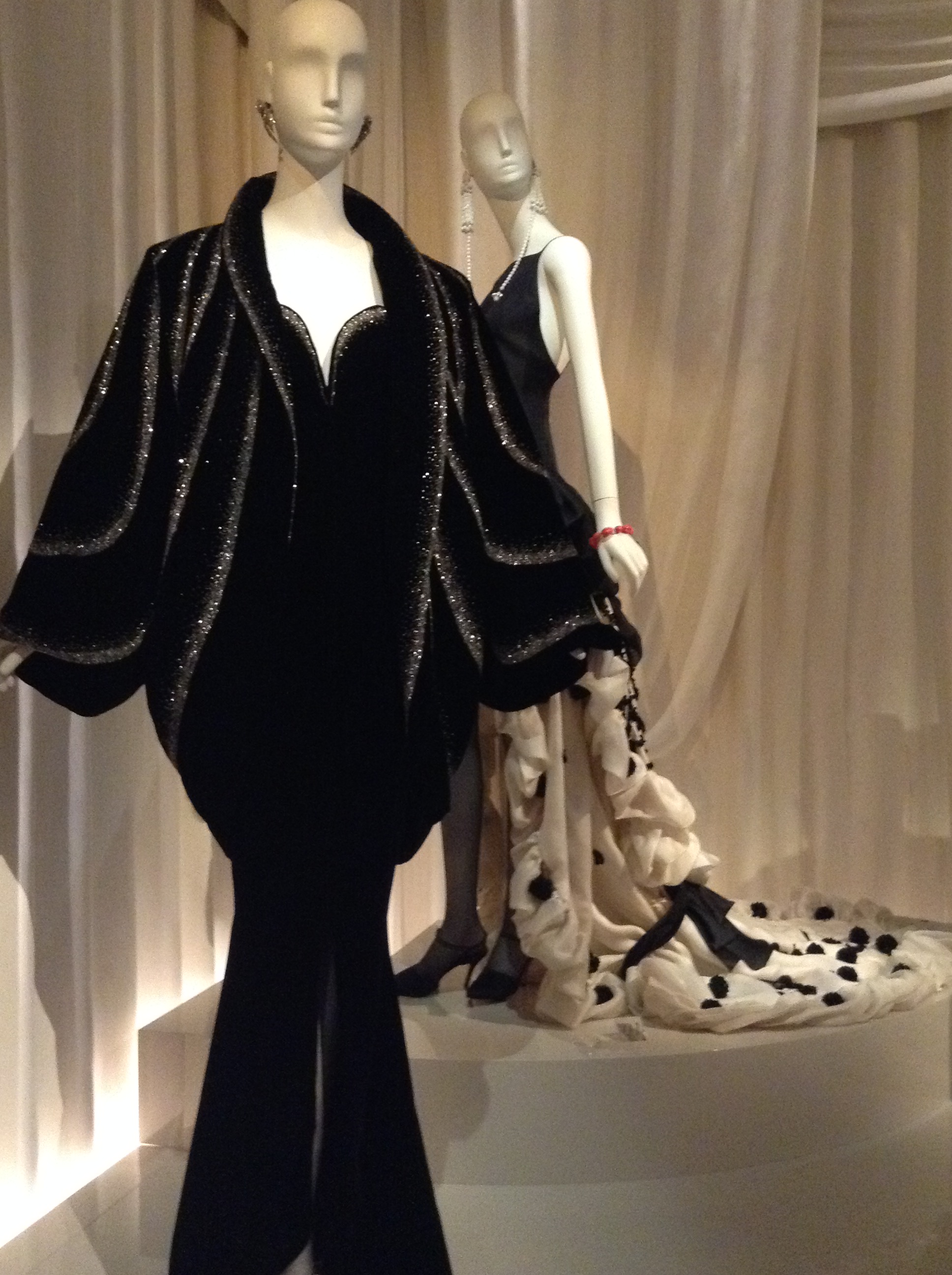 Black night outfit. Silk velvet, pearls. AW 1983. Prototype. Atelier Felipe.YSL decides to use luxurious materials and enveloping shapes to show that the body is free. This exotic creation is inspired by the Orient.Behind: Spanish dress. Tribute to Roland Petit and Christian Bénard. AW 1990. Prototype. Gazar and silk organza, pearl embroidery.