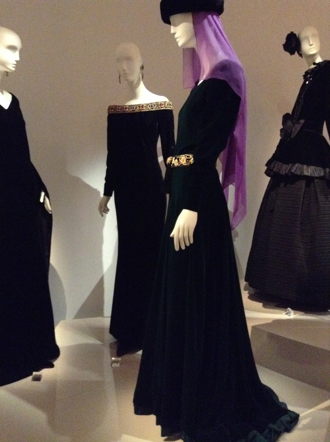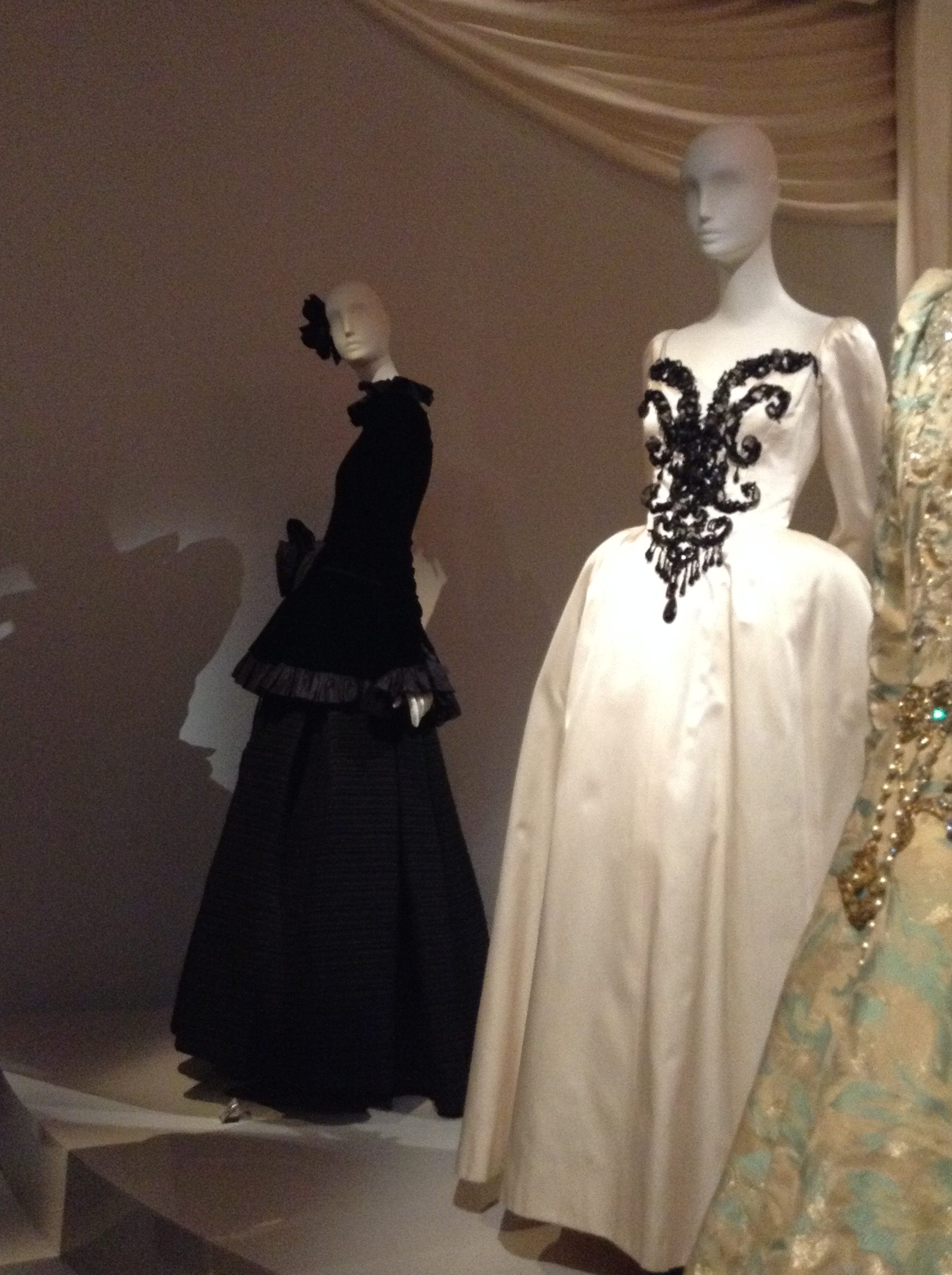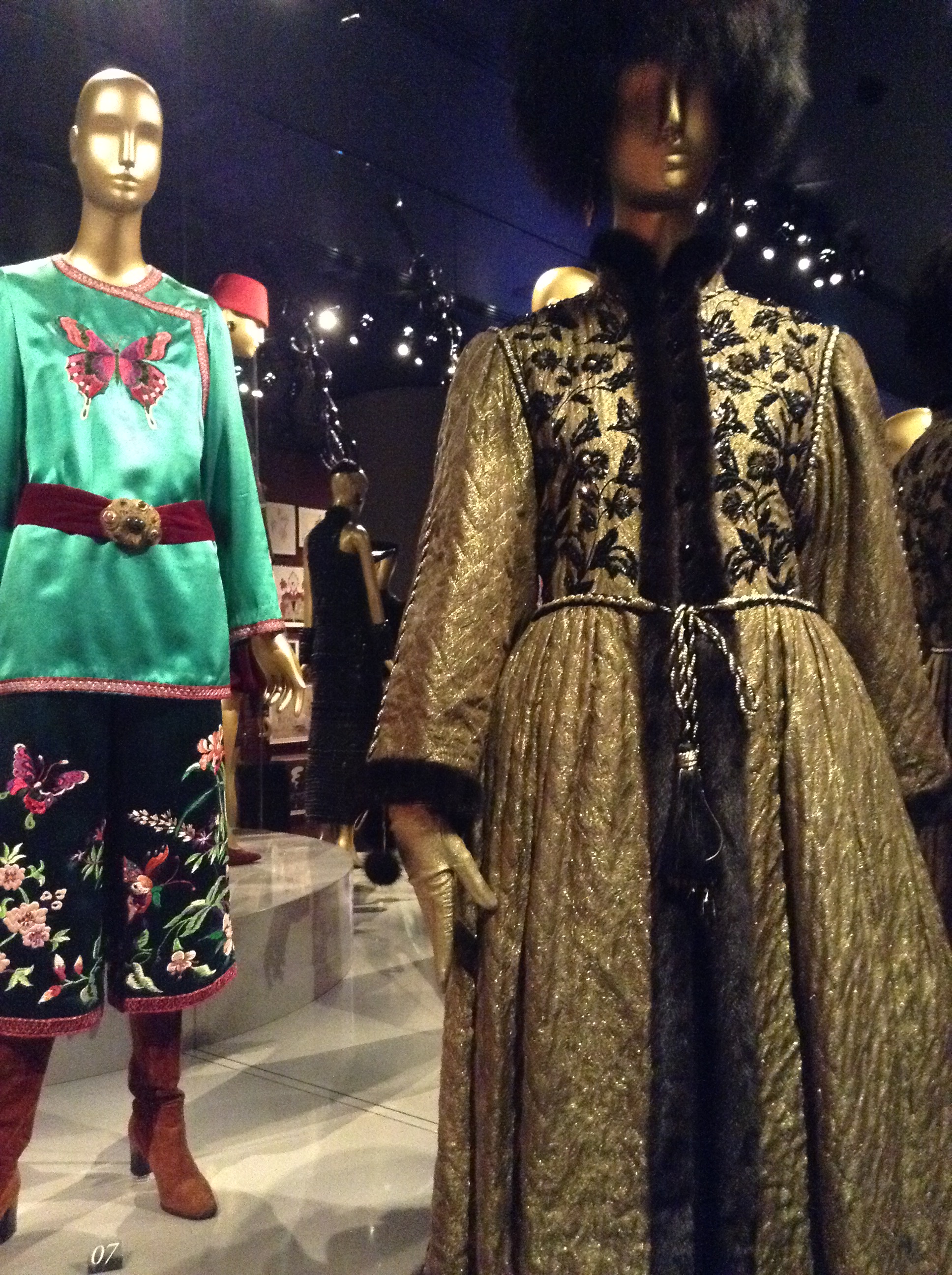 Black night outfit. Silk velvet, pearls. AW 1983. Prototype. Atelier Felipe.YSL decides to use luxurious materials and enveloping shapes to show that the body is free. This exotic creation is inspired by the Orient.Behind: Spanish dress. Tribute to Roland Petit and Christian Bénard. AW 1990. Prototype. Gazar and silk organza, pearl embroidery.