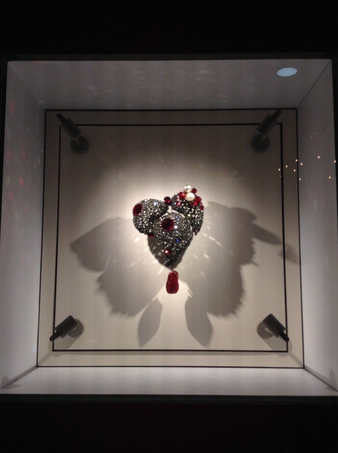 “Heart” necklace. 1979. Red and grey strass, red Cristal, white pearls and red glass. This is an emblematic YSL jewel. It was created in 1962 by the “Maison Scemama” and was reimagined in 1979.