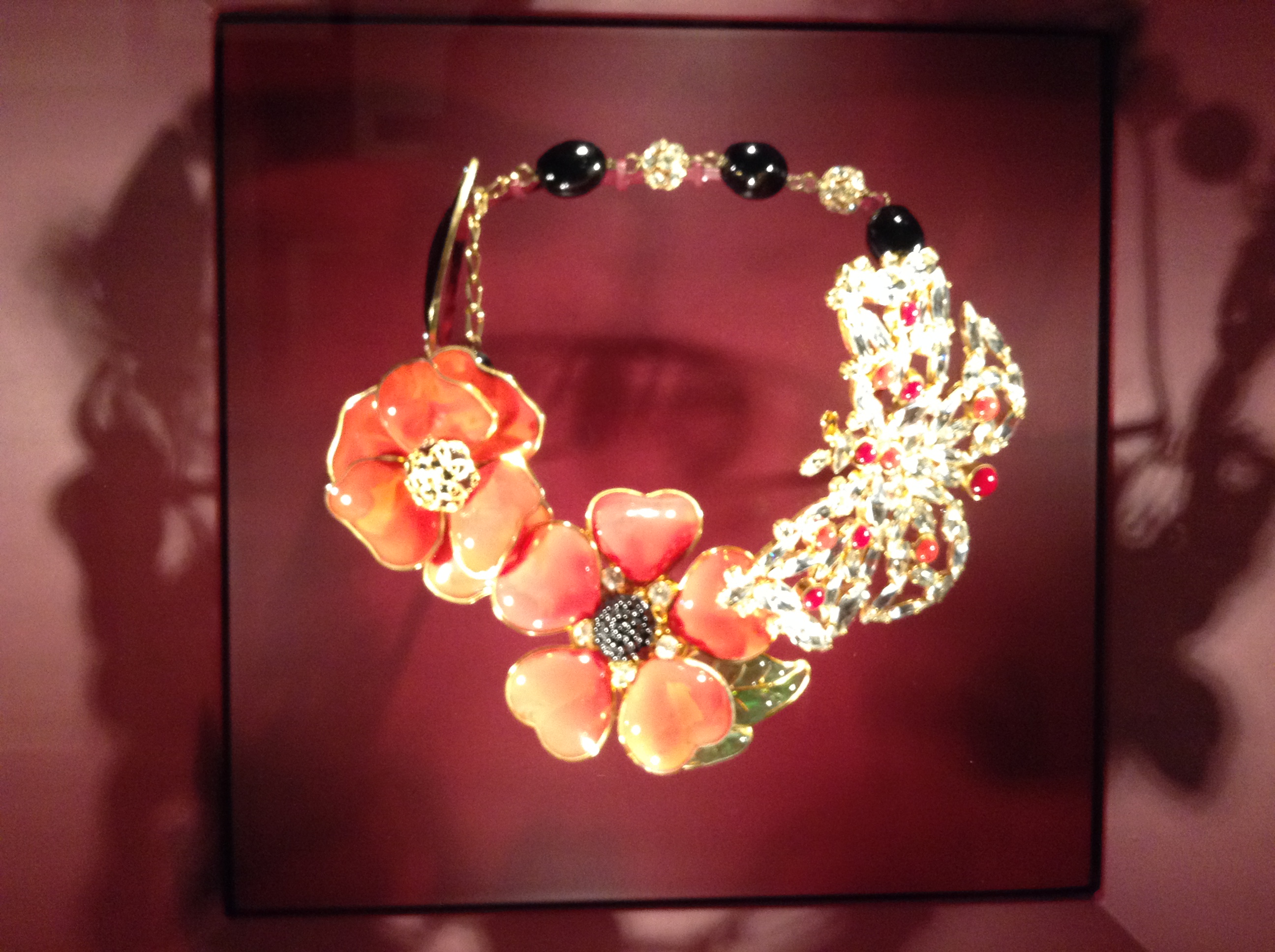 Necklace SS 1983. Metallic choker with glass orange flowers, a strass butterfly and black pearls.