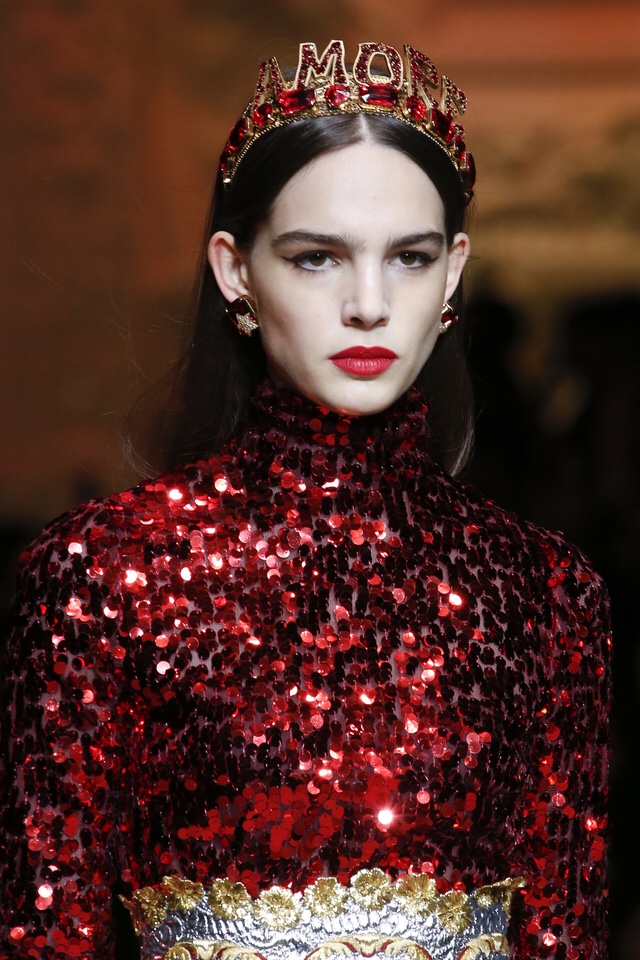 At Dolce and Gabbana powerful queens fill the catwalks. Wear a vivid red shade on your lips to master the look.