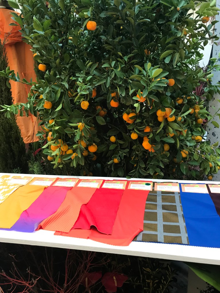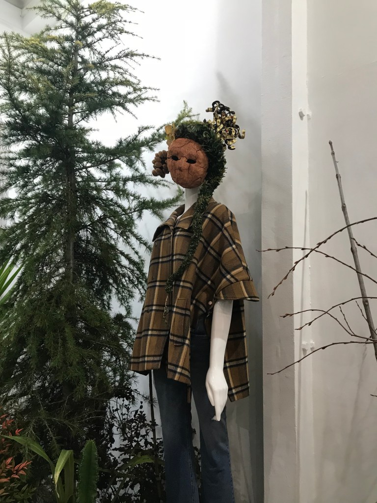 The vegetal section features botanical textiles blended into a garden decor. Models have clay faces and are surrounded by orange trees.