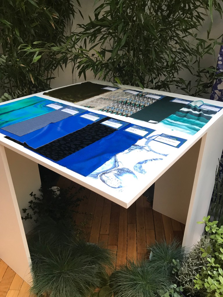 Textiles are organised into two categories. The ground-floor gathers future trends while the first floor showcases wintery pieces (clothes and accessories) and fabrics. The bottom floor called the “trend forum”, is divided into two sections: the aquatic and vegetal sections.