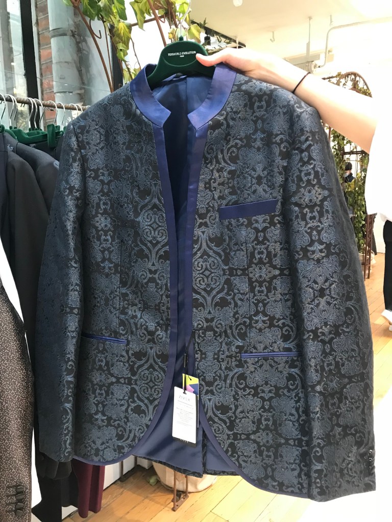 On the upper floor, printed tuxedos and oriental embroidery are on display.