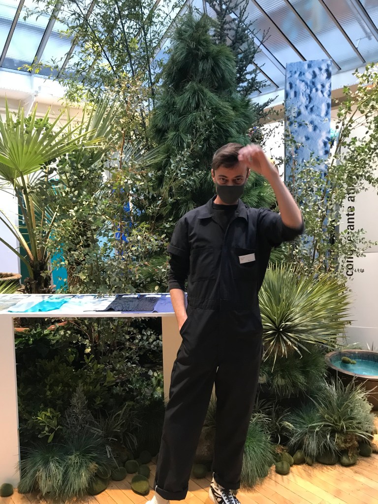 Designer Louis Gérin confesses Texworld is the biggest clothing showroom. Mess Frankfurt showrooms normally hold more than 900 000 exhibitors worldwide and about 1500-1800 in France. However, due to the sanitary situation, only 75 are featured. Showcasing 2500 items, the event shows a sample of textiles, Louis says, but also clothes.