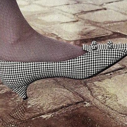 Christian Dior introduced the pattern in haute couture in 1950, in France. That year, he coined a houndstooth tailleur and stilettos with Roger Vivier in 1959 (picture by icon icon below).