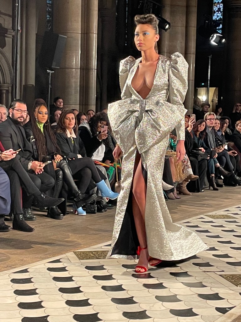 But then, another model walks in and I see the Hollywood vibes entering the show. She proudly rocks a V-neck with a huge silver bow, her dress epitomizing extravaganza and show business.
