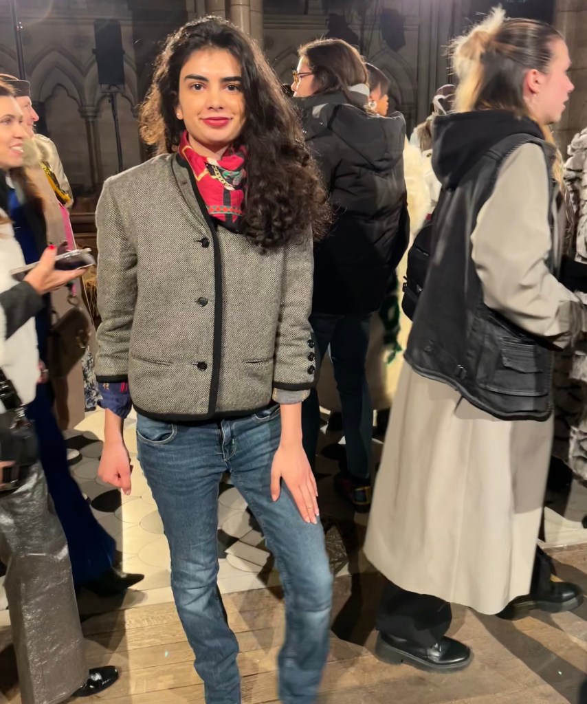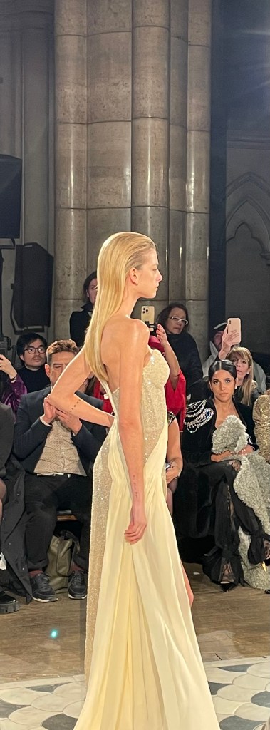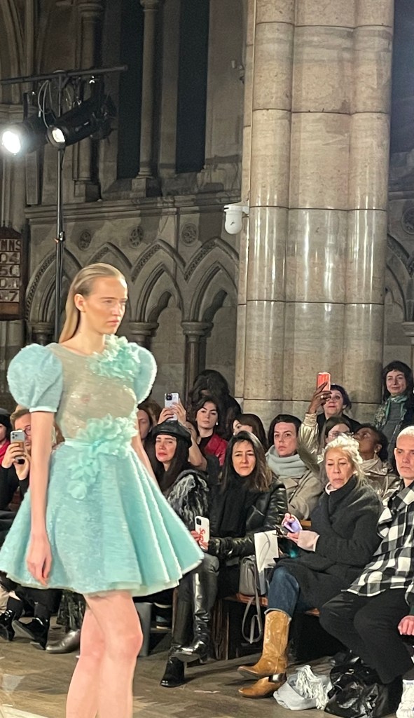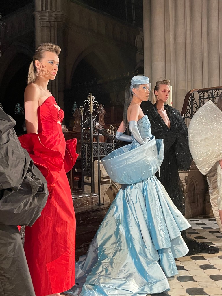 I arrive skiping the line and a lady from the staff looks at me saying “you’re from the press?” As I answer yes, I push the door and meet my peers, whereas the other guests are waiting outside. I sit down and notice a woman sitting with a dog which I reckon was about to witness his first fashion show. The man next to me smiles at me. “Hi, I am a photograph, he says.” I introduce myself and start talking about my blog. He starts telling me several anecdotes. “See the man in front of us? He is famous. I don’t remember his name but I used to see him in TV as a kid.” He adds “the basic red-haired man accross from us used to date a pretty model. She was only interested in his money. Obviously.” We stop talking as the show begins -the show is taking place in a cathedral which gives a sacred dimension to the outfits.
