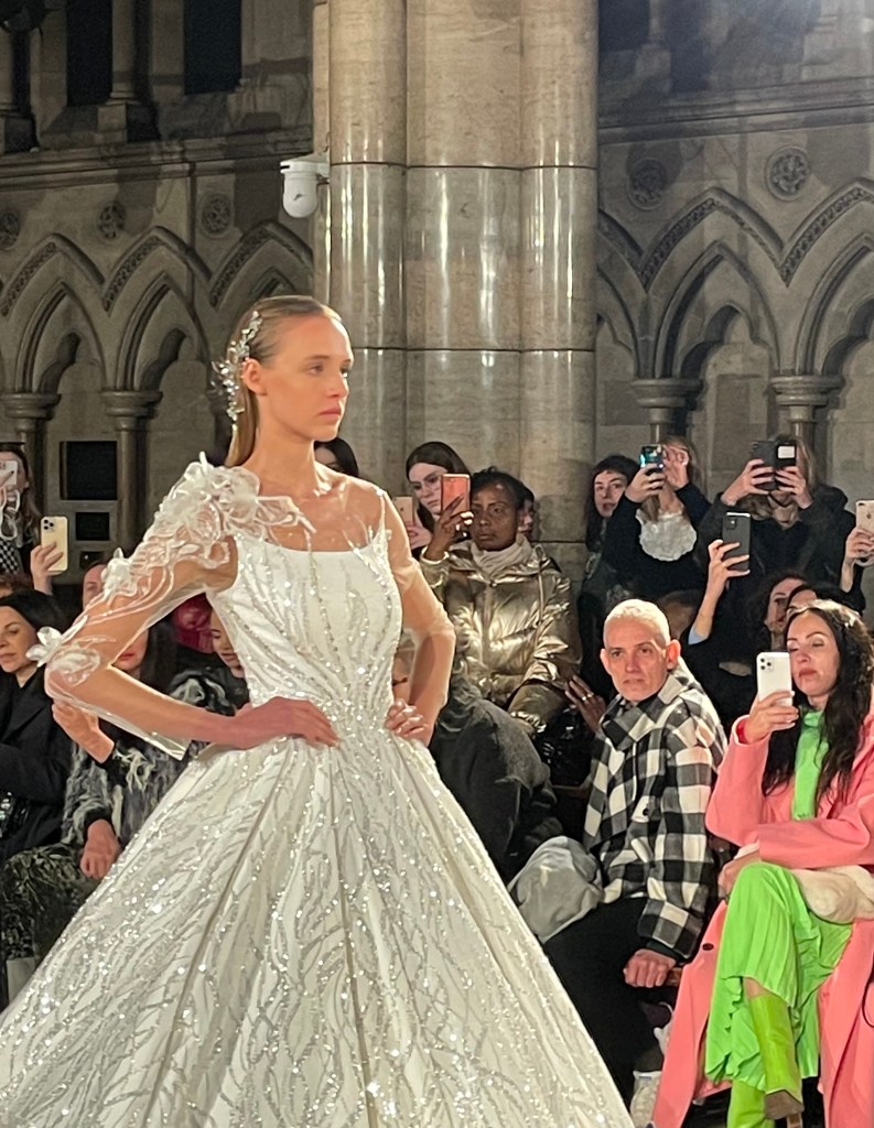 Another model is dressed with a white and silver (a huge trend this season) dress shining under the spotlights. Her transparent tulle sleeves hug her arms lighly. Clearly my favourite outfit of the show.