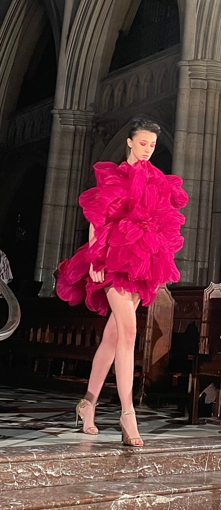 The show is called Hollywood. Am I witnessing the right show, I wonder, as the first model walks on the runway? She is dressed in a lovely bright pink dress the volume of which brings to mind petals. Shouldn’t the show be named bloom, I ask myself?