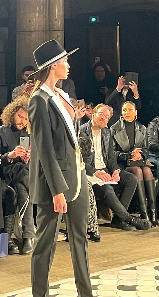 The show is called “light and dark.” I am wearing a black and white oufit (a fur jacket, black skirt and sweater and heels) a coincidence? I look in front of me. Many models reach the runway wearing black and white outfits, which gives a minimalist aspect to the show, bringing to mind designer Yoji Yamamoto. A model rocks a black and white suit, stating a form of emancipation dear to the roaring twenties.