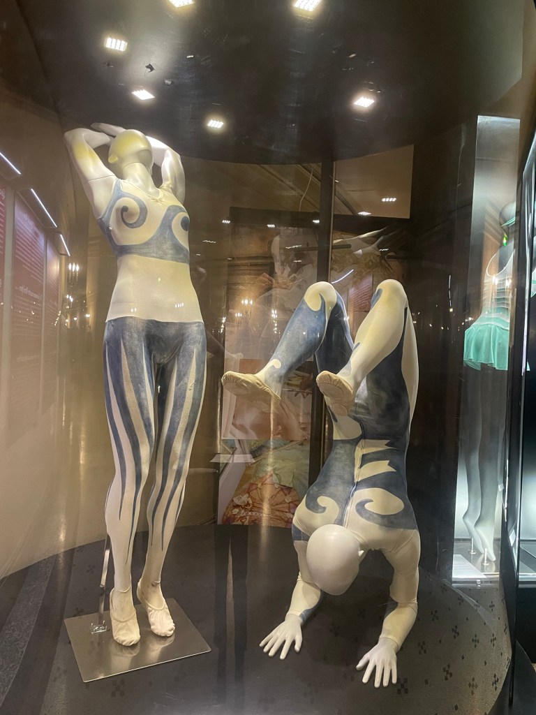 The exhibition starts with costumes designed by Coco Chanel in 1924 for Darius Milhaud’s Le Train Bleu. Jean Cocteau contributed to the writing of the performance. He was a friend of Chanel.